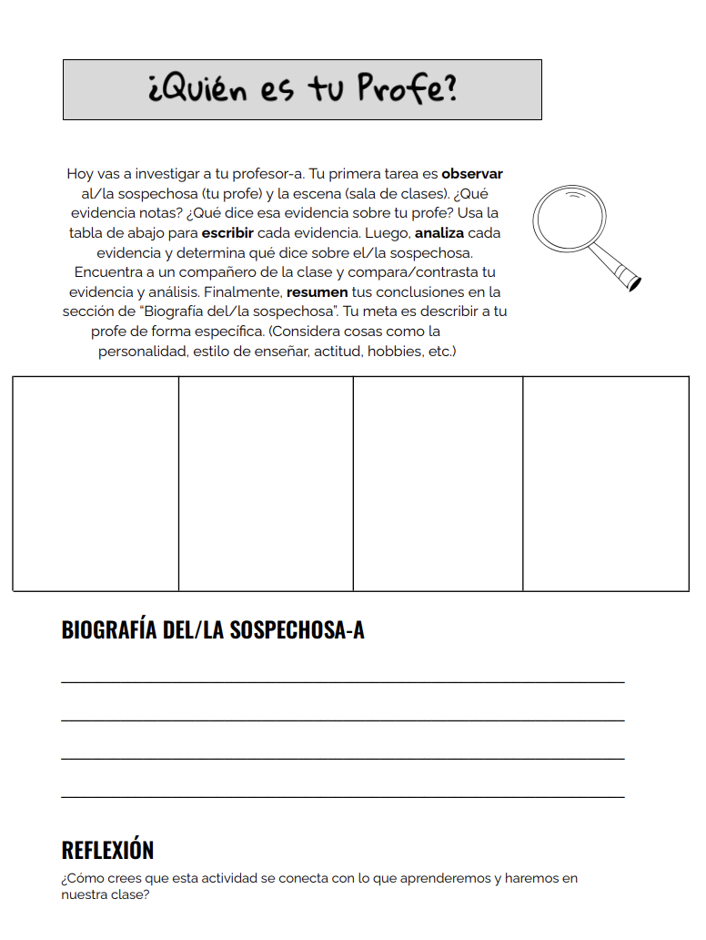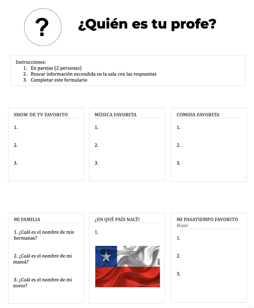 Actividad para descubrir quién es tu profe. Recomendado para docentes que comenzarán el año con estudiantes que no conocen. La actividad puede ser acomodada para realizar preguntas de curiosidad, y ajustarlo para un curso de estudiantes que ya conoces.