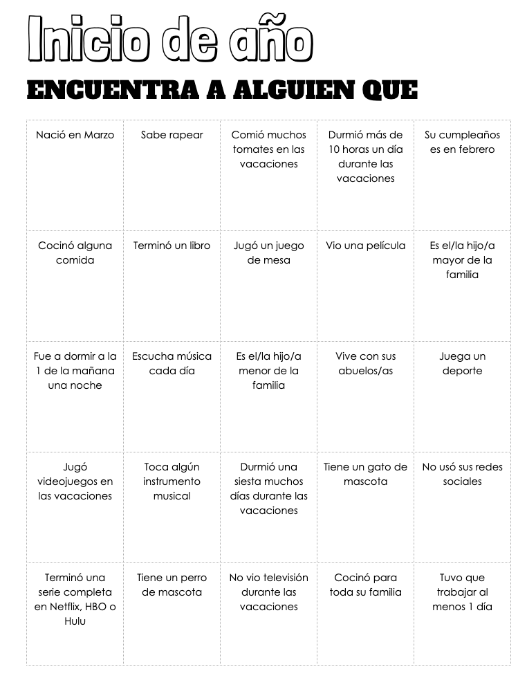 Actividad para la primera semana de clases donde tus estudiantes interactuarán con al menos 5 compañeros para hacerles preguntas. Las primeras 3 personas que logran un BINGO ganan. La idea es que puedan escribir el nombre de una persona en cada cuadro y que puedan generar una línea horizontal, vertical o diagonal.