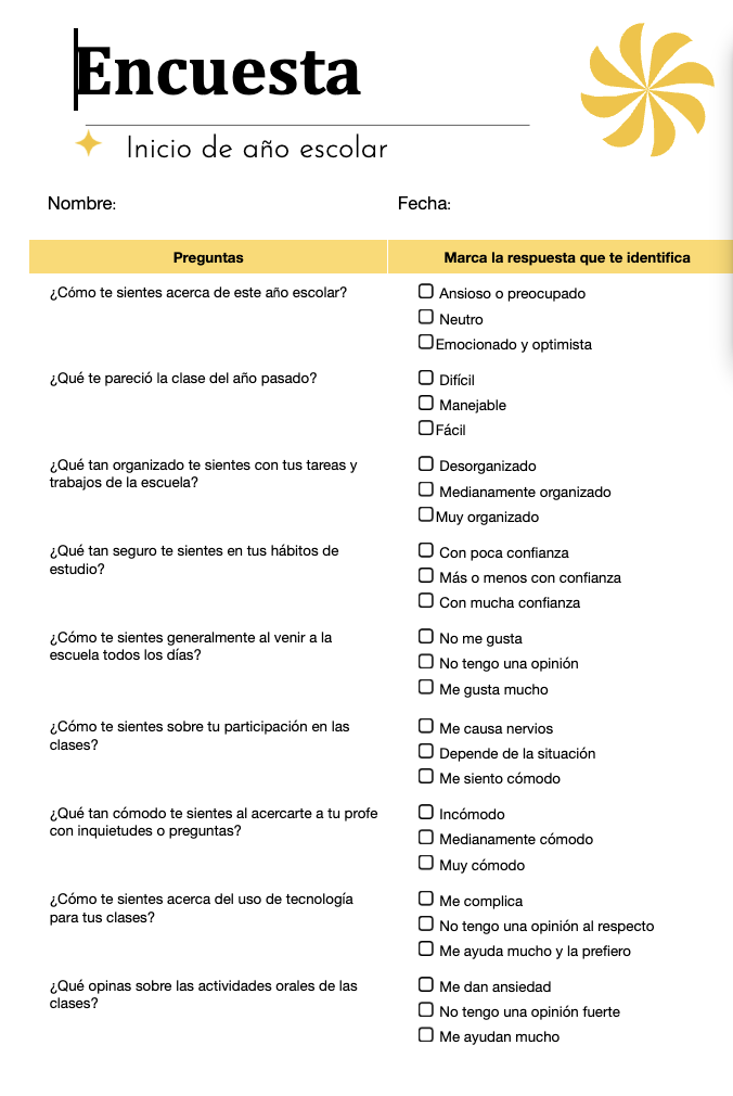 Esta encuesta es una herramienta diagnóstica integral para iniciar el año, diseñada para recopilar información sobre la salud, preferencias de aprendizaje y sensibilidades de tus alumnos. Al implementarla los primeros días, podrás anticipar adaptaciones necesarias en el aula -como la iluminación o la ubicación de los asientos- y estar preparado para gestionar alergias, medicación o emergencias médicas.